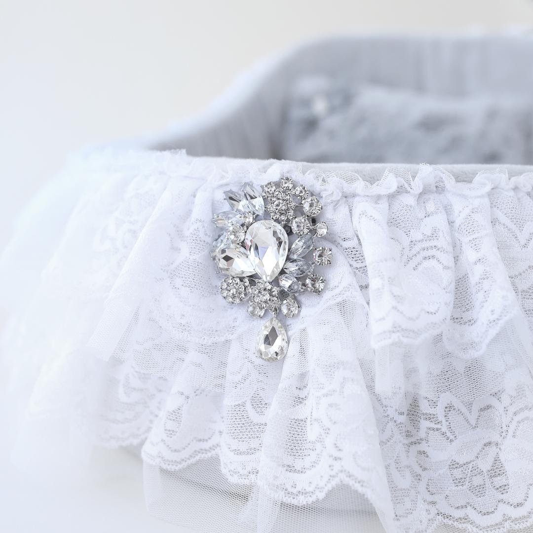 For that beautiful addition to your family, you'll want your pup to have sweet beginnings in our adorable Crib Bed by Hello Doggie, to lull your baby into sweet dreams. Trimmed in two-tiered romantic handmade lace, our cribs also feature a bouquet drop crystal brooch and removable pillow for easy care. Pair with any Hello Doggie Blanket. You'll be the envy of all your friends! Our collection offers four soft colors to choose from. One Size - *20" x 14" x 5 1/2"   |   Pillow inside - 18" x 12"   |   For dogs up to 6 Lbs MSRP - $177.99 *Bed is handmade and sizes may vary slightly. Made in USA.
