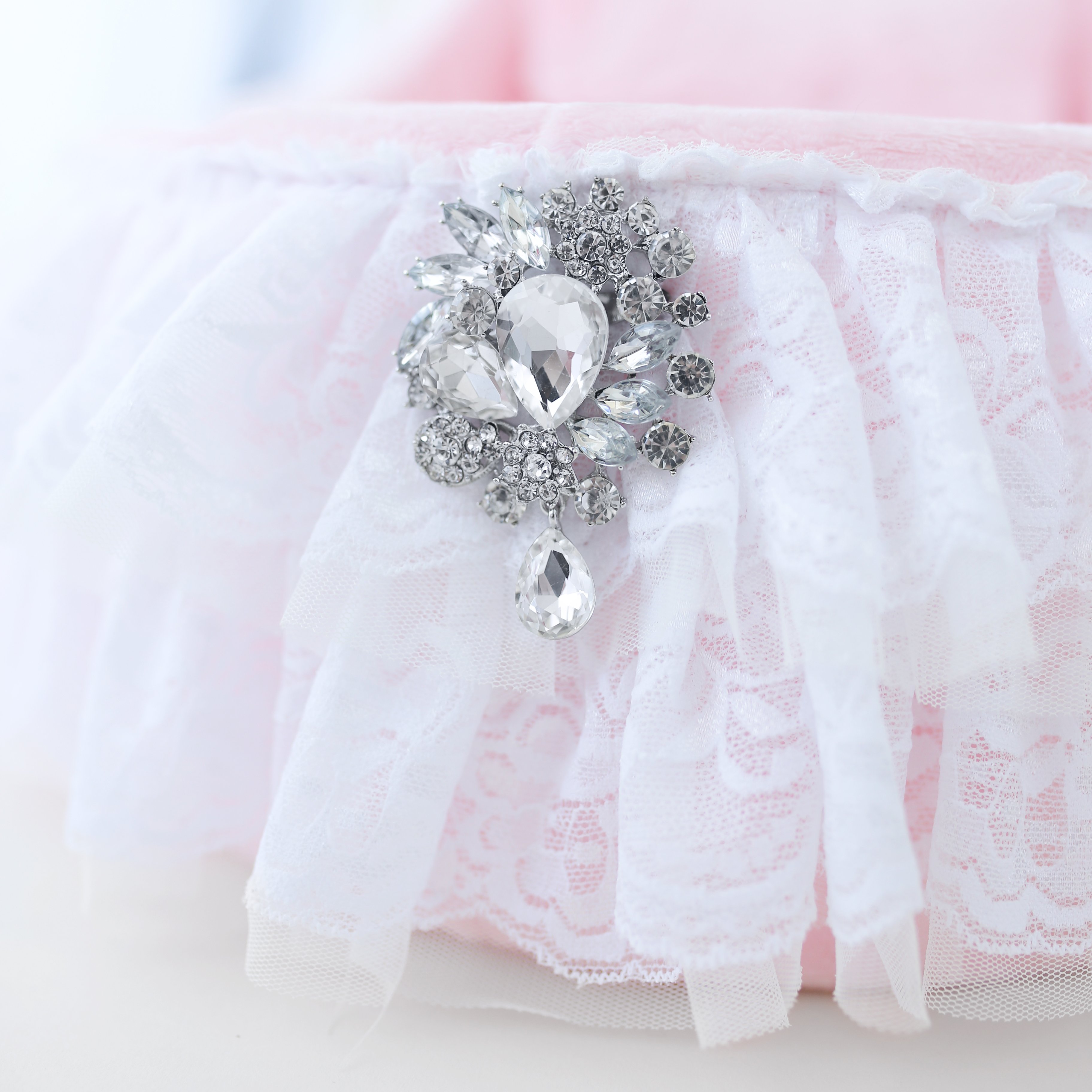 For that beautiful addition to your family, you'll want your pup to have sweet beginnings in our adorable Crib Bed by Hello Doggie, to lull your baby into sweet dreams. Trimmed in two-tiered romantic handmade lace, our cribs also feature a bouquet drop crystal brooch and removable pillow for easy care. Pair with any Hello Doggie Blanket. You'll be the envy of all your friends! Our collection offers four soft colors to choose from. One Size - *20" x 14" x 5 1/2"   |   Pillow inside - 18" x 12"   |   For dogs up to 6 Lbs MSRP - $177.99 *Bed is handmade and sizes may vary slightly. Made in USA.