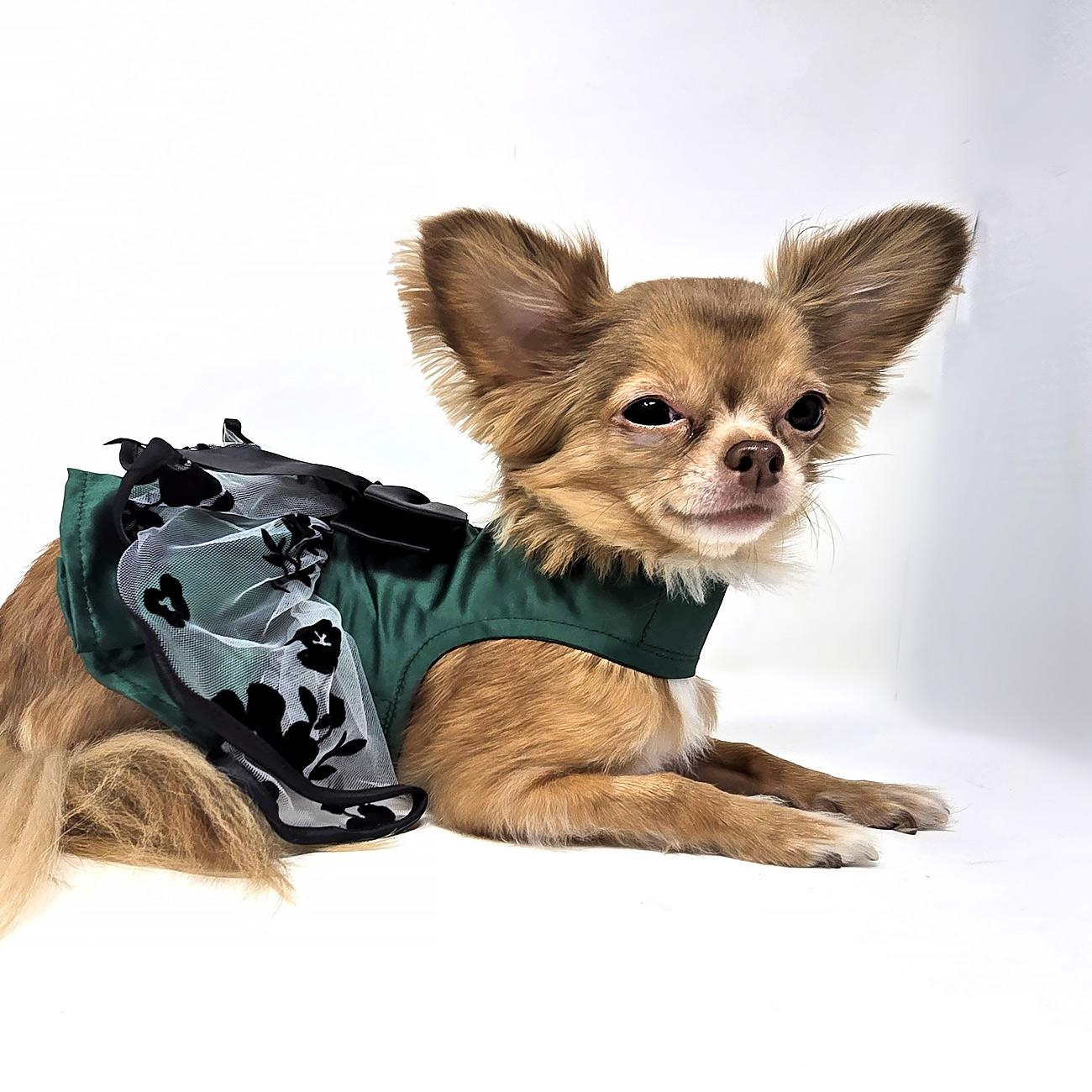 Sophisticated pups wear green. This beautiful green satin dress has a white tulle overlay featuring black velvet flowers. The overlay and neckline of the dress are trimmed in black while a pretty black bow completes the look.