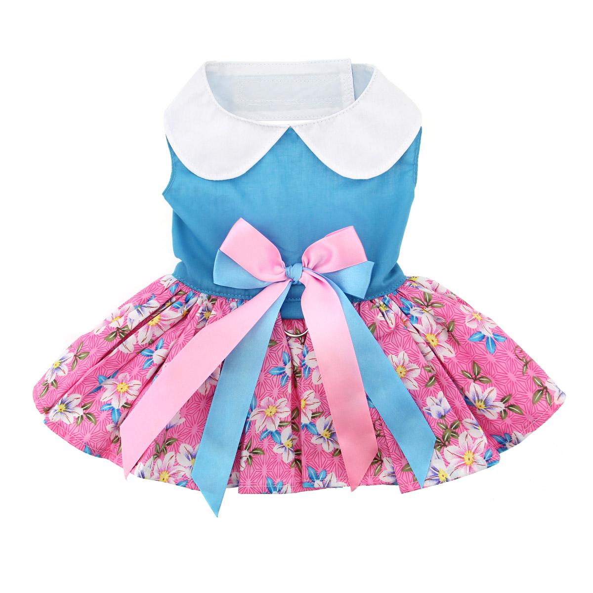 The vivid blue and pink colors in the Plumeria dress bring the season alive! This dress is complete with an adorable pink and blue bow and features our traditional hook and loop closure system on the neck and belly. Includes a matching leash, a sewn in D-ring for easy walking and has heavy duty hook and loop closure for added safety. (Size XL has a leash hole.)